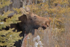 Profile of moose eating in the trees