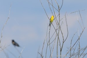American goldfinch with red winged blackbird
